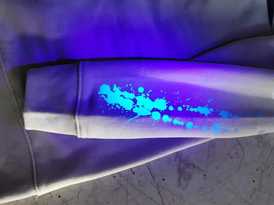 UV-reactieve inkt is een inkt op waterbases en heeft als eigenschap dat deze in UV licht verandert van kleur. Ook onder blacklight heeft UV-inkt fantastische effecten. Het is een transparante inkt, die in diverse kleuren leverbaar is en het beste uitkomt op lichte kleding of met een wit gedrukte onderlaag.