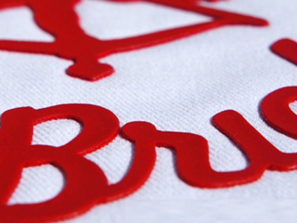 Brick transfer is een soort 3D transfer. Deze folie, gemaakt van pvc, wordt op dezelfde manier verwerkt als flex transfer maar heeft als eigenschap dat het tot wel 1 mm dik gesneden kan worden. Ook hiermee wordt, met behulp van een warmtepers, de folie op het textiel gedrukt. Brick transfer is leverbaar in 6 kleuren en in mat en glans. Leverbaar vanaf 100 stuks.